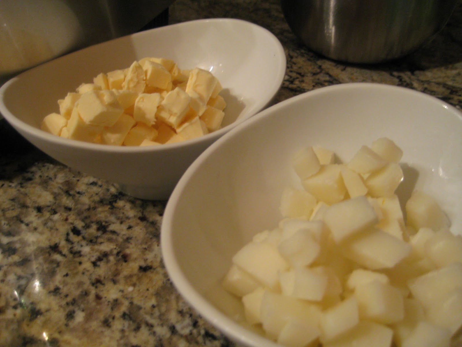 For the crust, I used the vegan Buttery Double Crust recipe from the November 2011 issue of Yoga Journal, which comes from Isa Chandra Moskowitz and Terry Hope Romero's Vegan Pie in the Sky. The recipe isn't currently online, but it calls for flour, salt, sugar, vegan margarine, vegan shortening and cider vinegar. I used Earth Balance buttery sticks and vegetable shortening. Both of them contain soy, but I'm hoping that the small amount of pie I'll have won't knock me over allergy wise. I used my food processor to make the dough for the crust, rather than cutting in the "butter" and shortening by hand. I did cut the "butter" & shortening into small cubes first, and then put those cubes in the freezer for a bit to firm them back up.